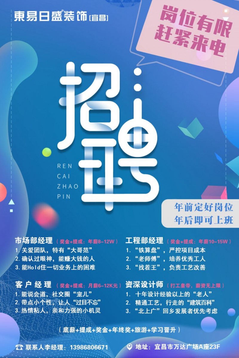 我公司成立16周年,家装第一品牌、家装上市第一股(股票代码002713)东易日盛,是集设计、施工、售后服务一体的宜昌市优秀装饰企业,诚招聘以上岗位,企业人性化管理,待遇优厚,欢迎大家自荐和举荐