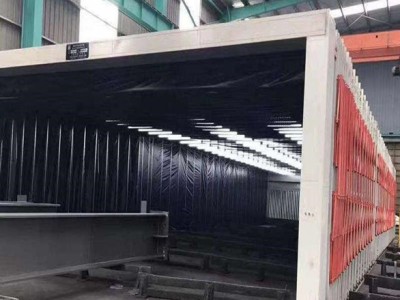 整体移动式喷漆房主要应用于大型工件的打磨或喷漆工作中,方便收集工作中产生的粉尘或废气。在一般情况下每套房体设设置有2-3个排风净化工位,哪个工位上的工件需要喷漆时,房体则行走移动到那个工位,其他工位可以继续打磨工作,待房体内的工件喷漆完毕后,再控制移动房体行走到打磨完毕的工件工位,如此设计可以实现大型工件的不间断连续喷漆工作。房体为钢结构构造,房体立柱下面设置有两台电动驱动行走机构,行走机构沿地面轨道行走。移动房体两端设置有电动卷帘大门,房体行走时,大门升起,待到达指置时,大门降落关闭。大门与行走机构由电气控制部分连锁控制,大门升起后,房体才可移动行走。