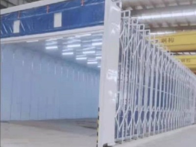 伸缩式喷漆房采用活动式框架结构,内衬玻璃纤维防火篷布,通过进出口门头处的驱动电机,通过轨道带动整体结构进行伸缩运动;非工作时间可将喷漆房整体折叠,***节省了车间场地,作业时根据实际情况调节入口处卷帘,控制补风,从而提高作业时产生漆雾的回收效果。