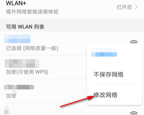 3、进入到WLAN页面后,找到连接中的wifi,长按此wifi后在下拉菜单中选择:修改网络。