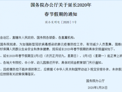 国务院办公厅27日发布关于延长2020年春节假期的通知。经国务院批准,为加强新型冠状病毒感染的肺炎疫情...[详情]