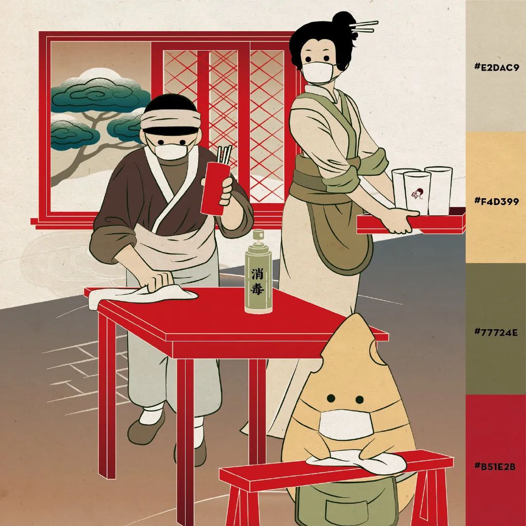 再譬如下面这套插画节选,运用工笔画的技巧,色调上以传统的朱砂红和墨绿制造对比,再将人物画面融入喜茶自身的形象,于是江湖风喜茶录就这样诞生了。