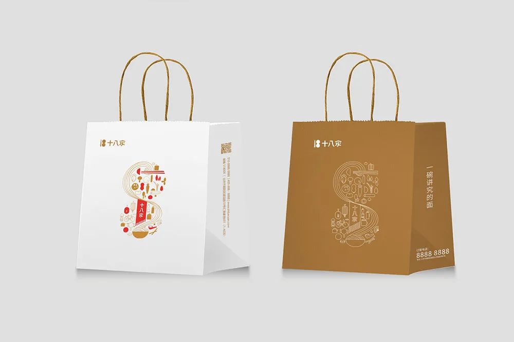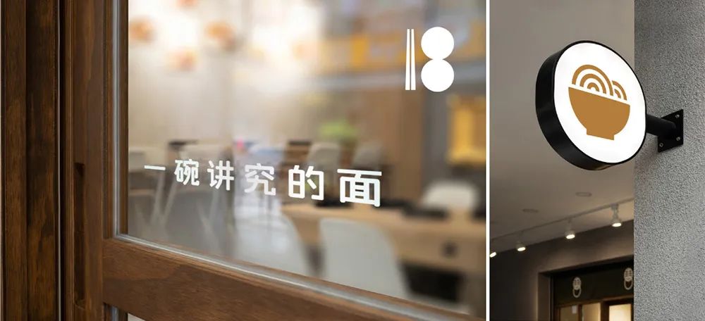 整体来看,图形部分非常简单,而且具有较强的品牌辨识度。我觉得去这家店吃完面花3秒钟摆个「十八汆」的Logo应该是不成问题。在后期的应用中,「8」字可以作为一个独特的符号,增加了品牌在场景化应用的连接作用。