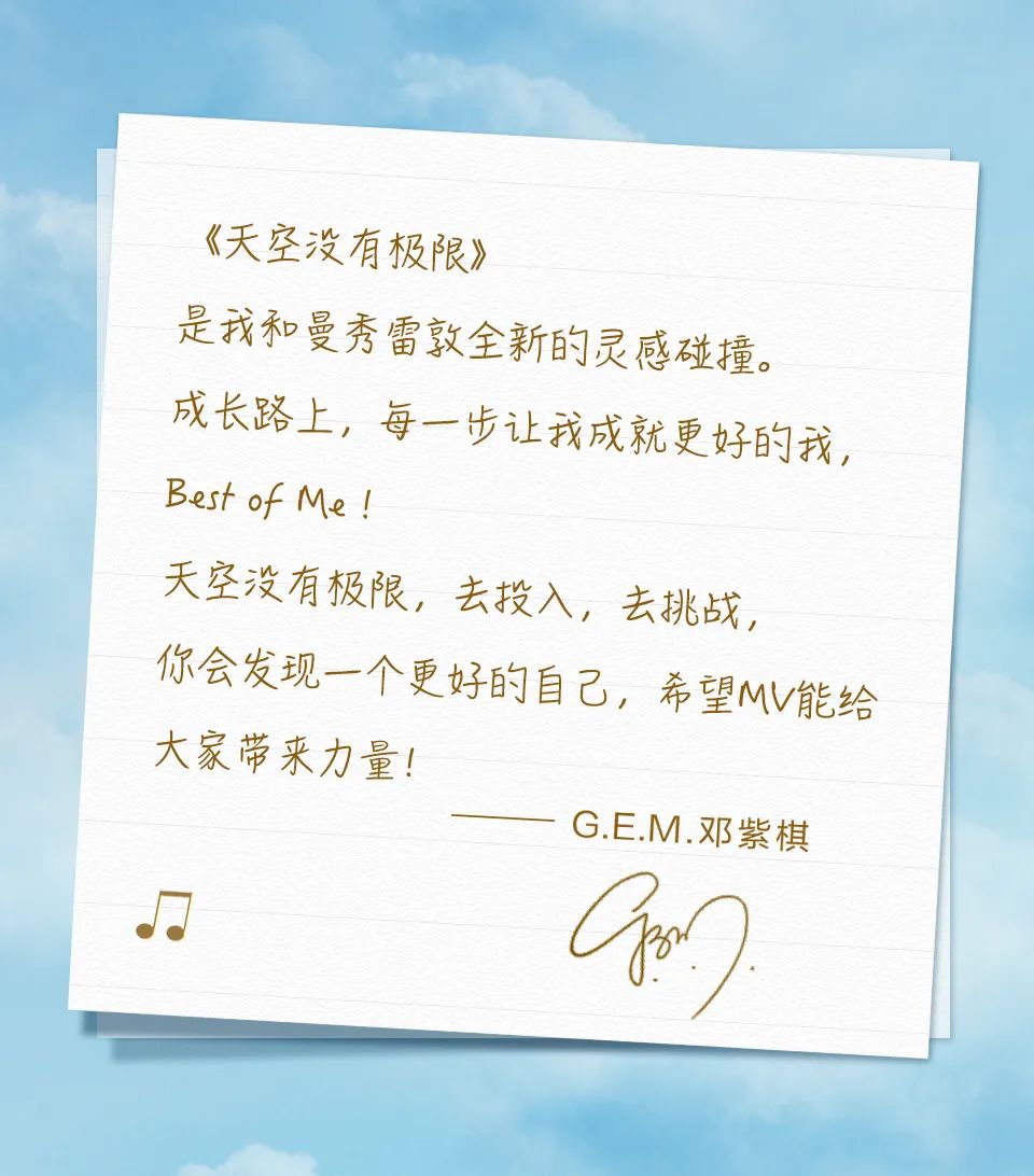 近日,曼秀雷敦品牌代言人邓紫棋制作了一支 MV 《天空没有极限》。通过这首倾心之作,诉说她的每一步前行,《天空没有极限》,拥抱热爱,伸手触梦,我们都能。