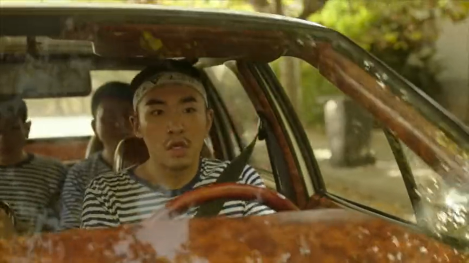 汽车发动,沈教练和三名学员在欢快的音乐中摆动身体。