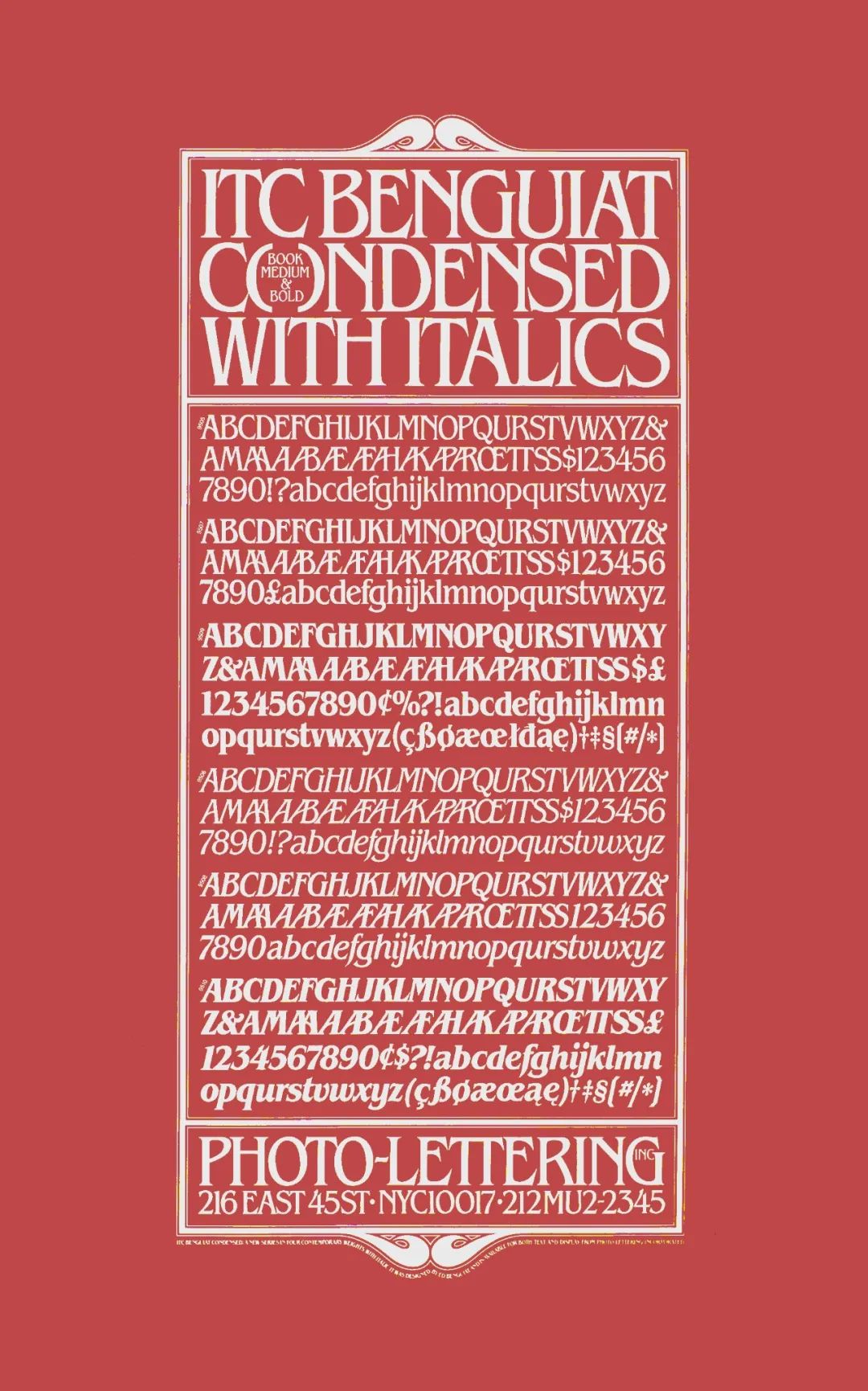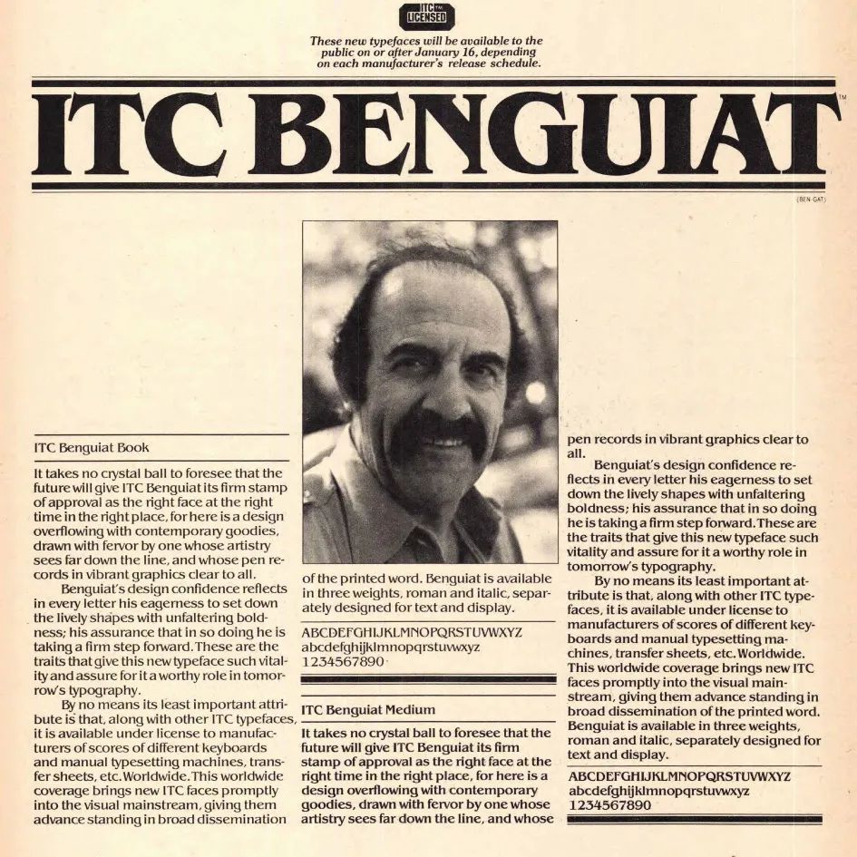 1971年,Benguiat加入了由设计师Herb Lubalin、Aaron Burns和Ed Ronthaler组成的公司 ——The International Typeface Corporation(国际字体公司,简称ITC),和ITC共同开启字体生产行业。ITC是市面上第一家为字体设计师提供服务的公司,他们也是最早一批有意将字体设计向市场推销的设计师。