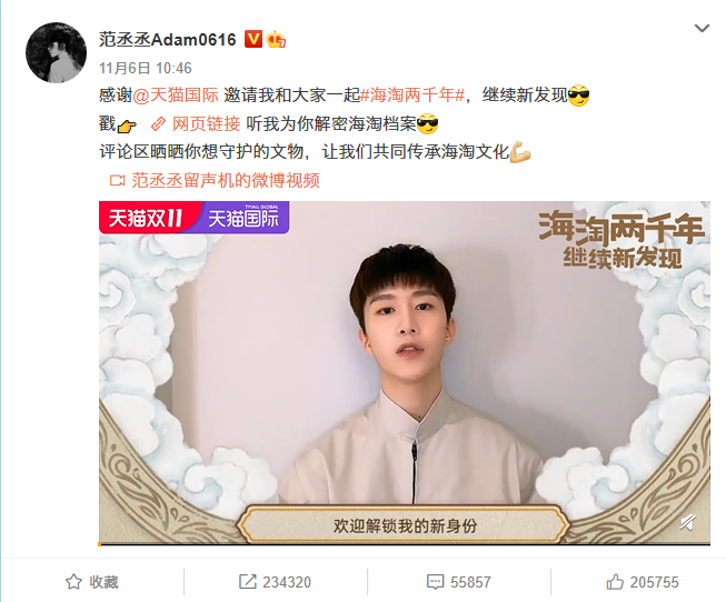 《引爆点》有一个“个别人物”法则:“一个信息想要流动起来,必然要经过某些特殊人物的社交能力、活力、热情和魅力传播出去。”天猫国际邀请品牌代言人兼海淘文化传承官范丞丞、宋茜,通过微博发声、视频站台的形式,号召大众一起传承海淘精神、守护海淘文化。