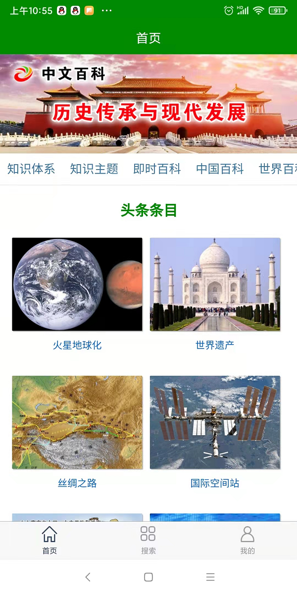 打开这款APP,看到它的主页,就能初步感觉到它是一部系统的网络百科全书。首先是“头条条目 ”,反映着该APP的基本内容,也是进入更丰富的内容的窗口。