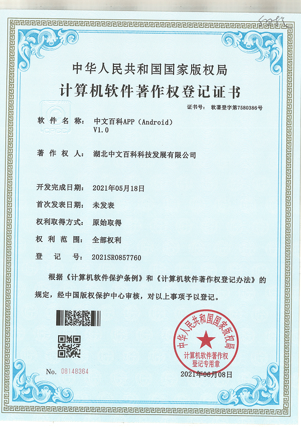 其二,2021年6月8日,《中文百科APP》(Android)获得中华人民共和国国家版权局《计算机软件著作权登记证书》,证书号是:软著登字第7580386号;登记号:2021SR0857760。