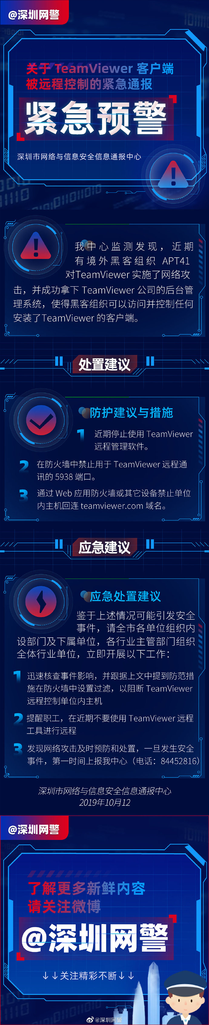 深圳网警在微博发布紧急通报称,深圳市网络与信息安全信息通报中心发现,近期有境外黑客组织APT41对TeamViewer实施了网络攻击,并成功拿下TeamViewer公司的后台管理系统,使得黑客组织可以访问并控制任何安装了TeamViewer的客户端。