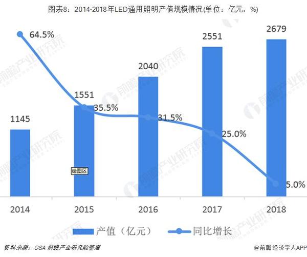 受益于led渗透率的快速提高,近年来通用照明占比下游应用市场比例不断提高,从2010年的21%提升至2018年的44.06%,最高时2017年占比达到47.8%。据csa统计数据显示,2014-2018年,我国led通用照明产值规模持续提升,2018年达到2679亿元,同比增长5.0%。