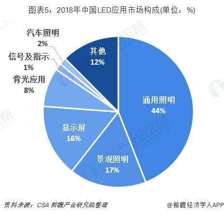 2018年,我国led应用市场产值约为6080亿元,同比增长13.8%,其中led照明领域的通用照明仍是最大应用市场,2018年产值达到2679亿元,同比增长5.0%,占整个应用市场份额为442%;景观照明紧随其后,产值为1007亿元,同比增长26%,占整体应用市场的16.5%;led显示屏位列第三,产值为947亿元,同比增长30.2%,占整体应用市场的15.5%。