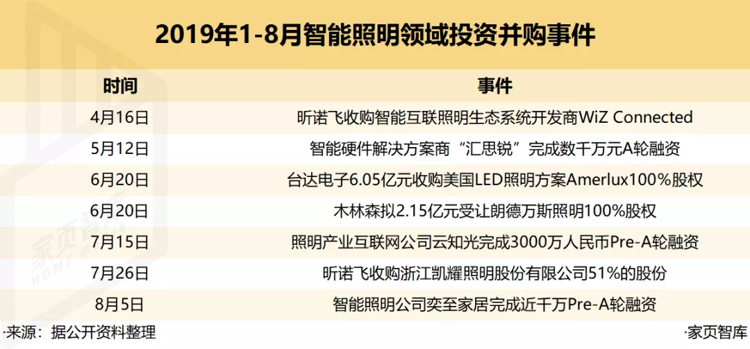 截至9月24日,2019年我国智能照明领域共完成7起投资并购,总金额超过8.7亿。