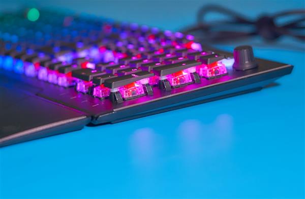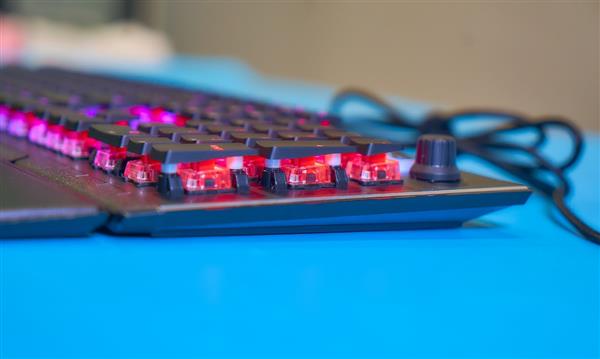 从上面的图片可以看出,冰豹vulcan 121在泰坦茶轴的灯光效果要远远强于普通的机械键盘。普通的机械键盘只能键帽上的字体能透光,而vulcan 121所采用的泰坦茶轴由于采用了透明结构外壳,因为连键轴也能透光,整个键盘的发光面积要远远高于常见的机械键盘。