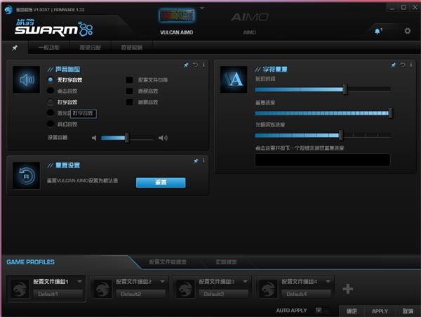 “一般功能”里面可以设置按键音效。尽管vulcan 121按键音很轻,但是为了照顾到一些喜欢敲击音的同学,在这里就可以设置在打字时让电脑音箱播放击键音,这里一共有四种音效可供选择,即便带上耳塞玩游戏,也能听到按键音。