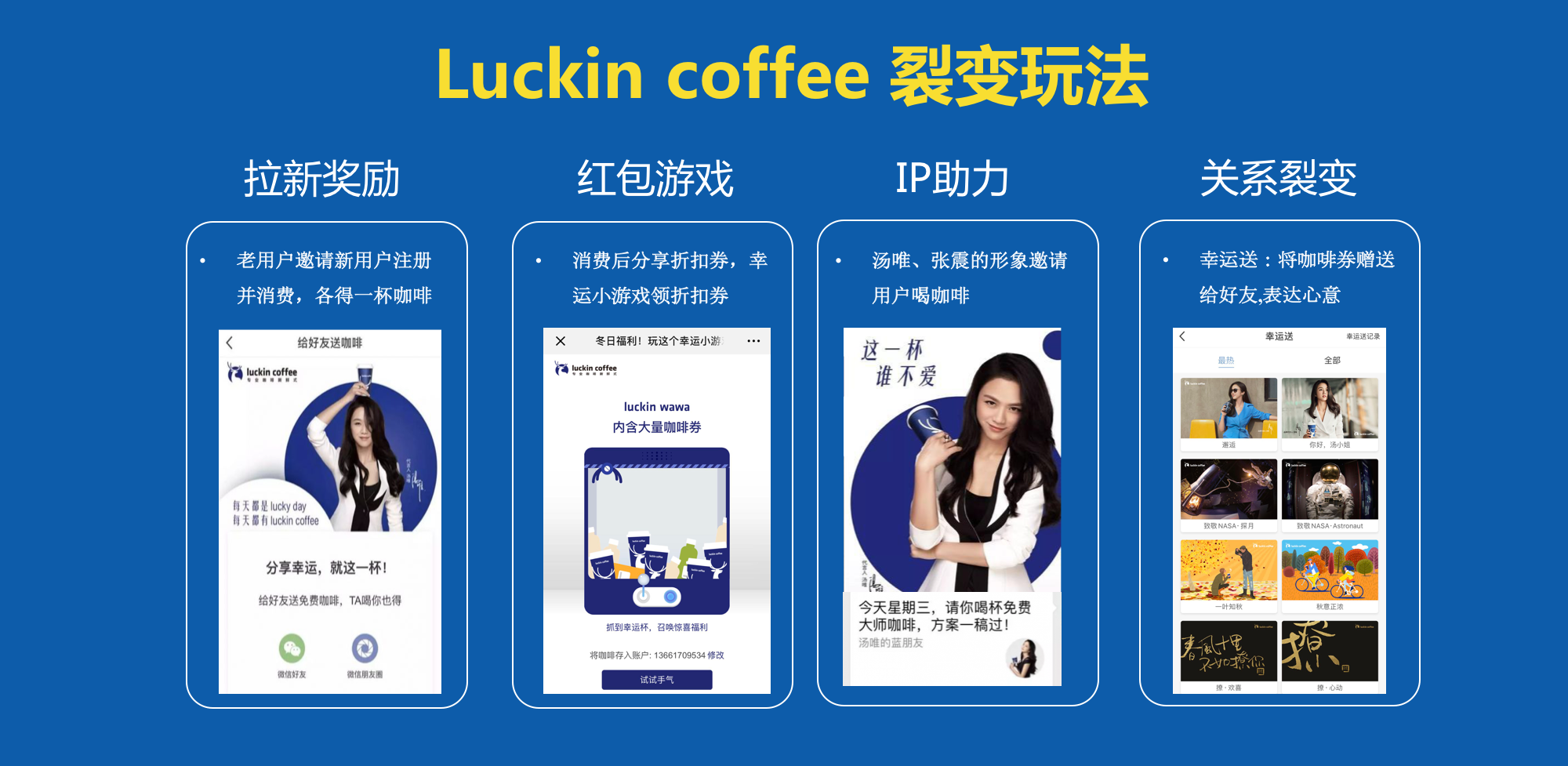 Luckin coffee的裂变营销玩法:拉新奖励、红包游戏、IP助力、关系裂变等。
