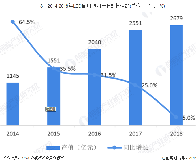 受益于led渗透率的快速提高,近年来通用照明占比下游应用市场比例不断提高,从2010年的21%提升至2018年的44.06%,最高时2017年占比达到47.8%。据csa统计数据显示,2014-2018年,我国led通用照明产值规模持续提升,2018年达到2679亿元,同比增长5.0%。