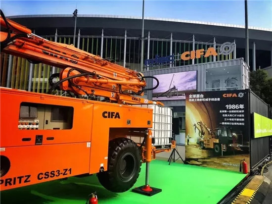 作为中联重科欧洲最早的子品牌,在产品研发上一直走在行业前列的意大利cifa为第二届进博会带来css-3湿喷机这一混凝土机械精品。作为中意技术深度融合产品,css-3湿喷机是国内唯一可用电动机和柴油机双动力进行喷射作业的设备。设备采用全球首创九个自由度的机器人臂架系统,实现无喷射死角。