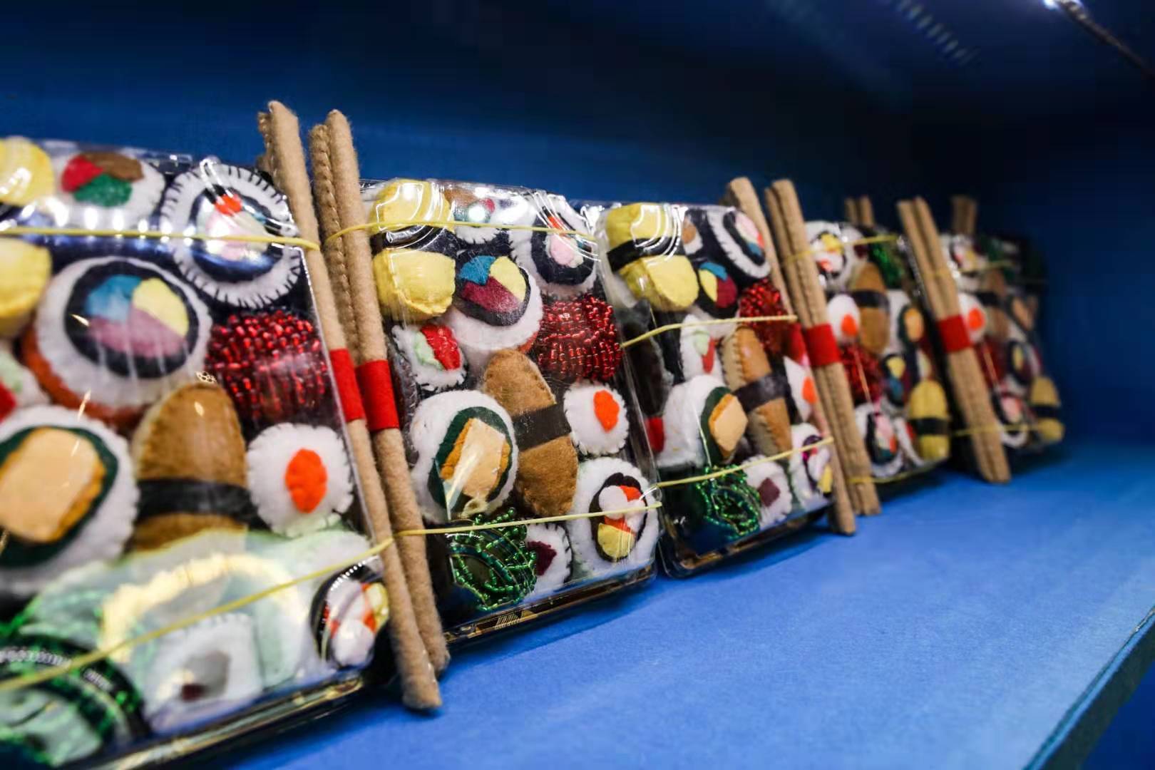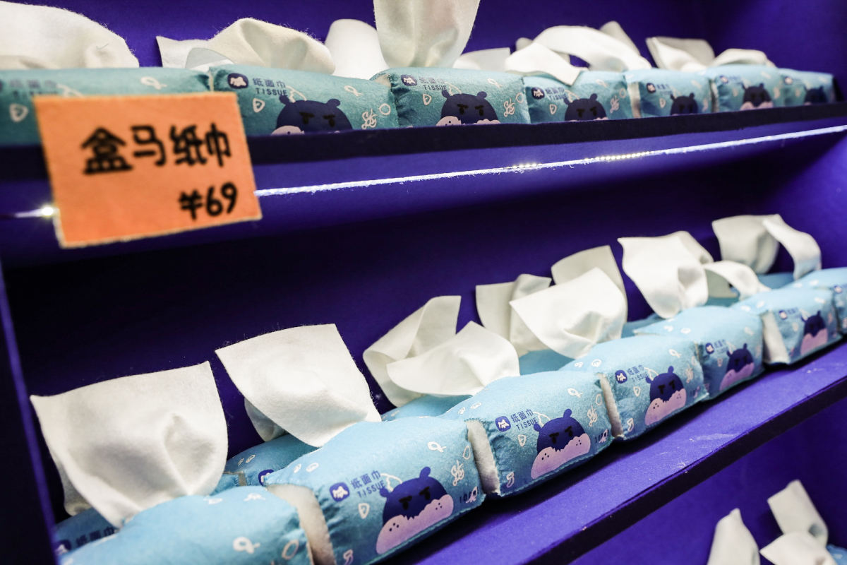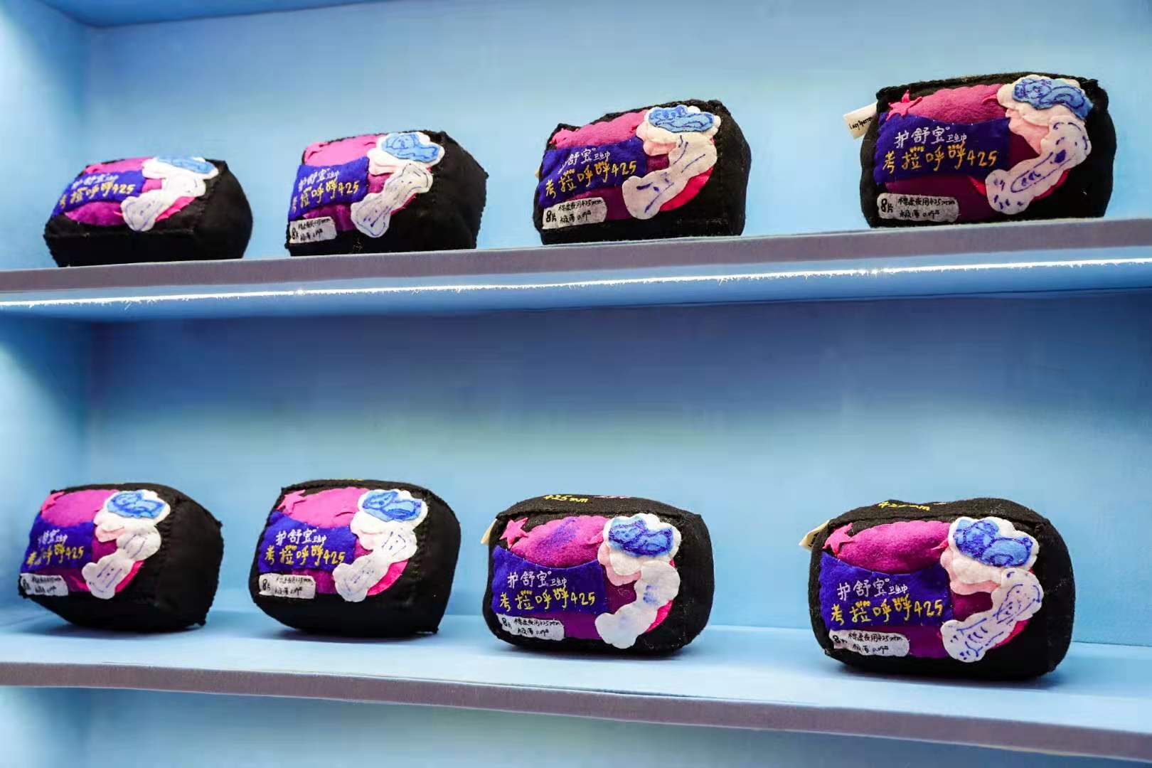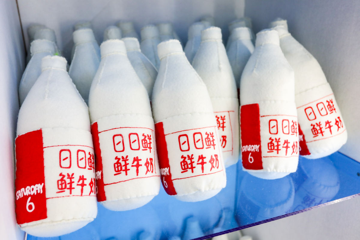 发现了没!你能在盒马鲜生卖场里买到的日日鲜牛奶、帝皇鲜黑虎虾、帝王蟹、寿司等新鲜食物,以及奥妙洗衣液、多芬洗面奶和护舒宝卫生巾等生活用品,在这里都化身呆萌柔软的毛毡艺术品,并且都带着笑脸向你发出十万伏的可爱电力,让你不得不举钱投降。