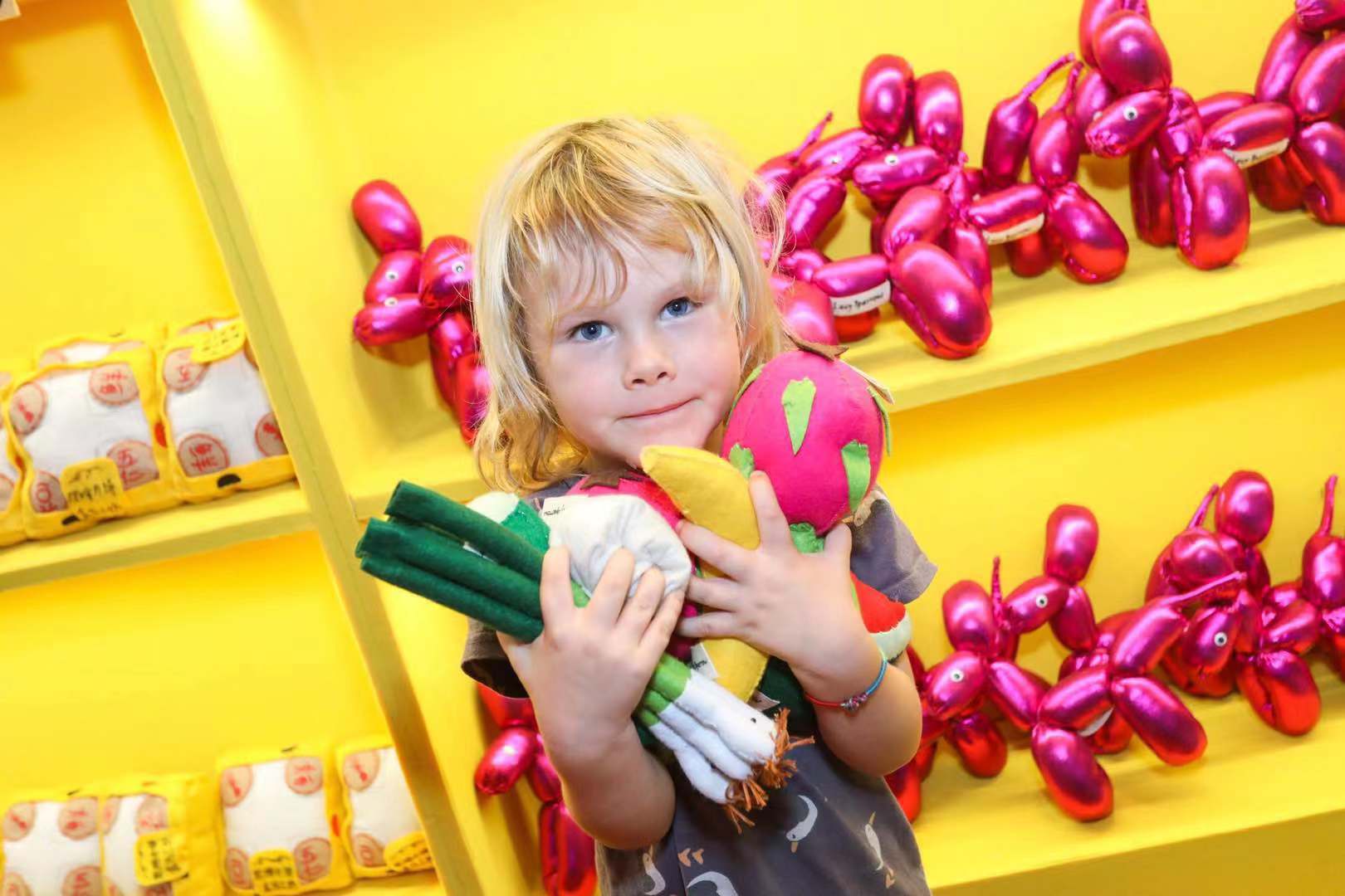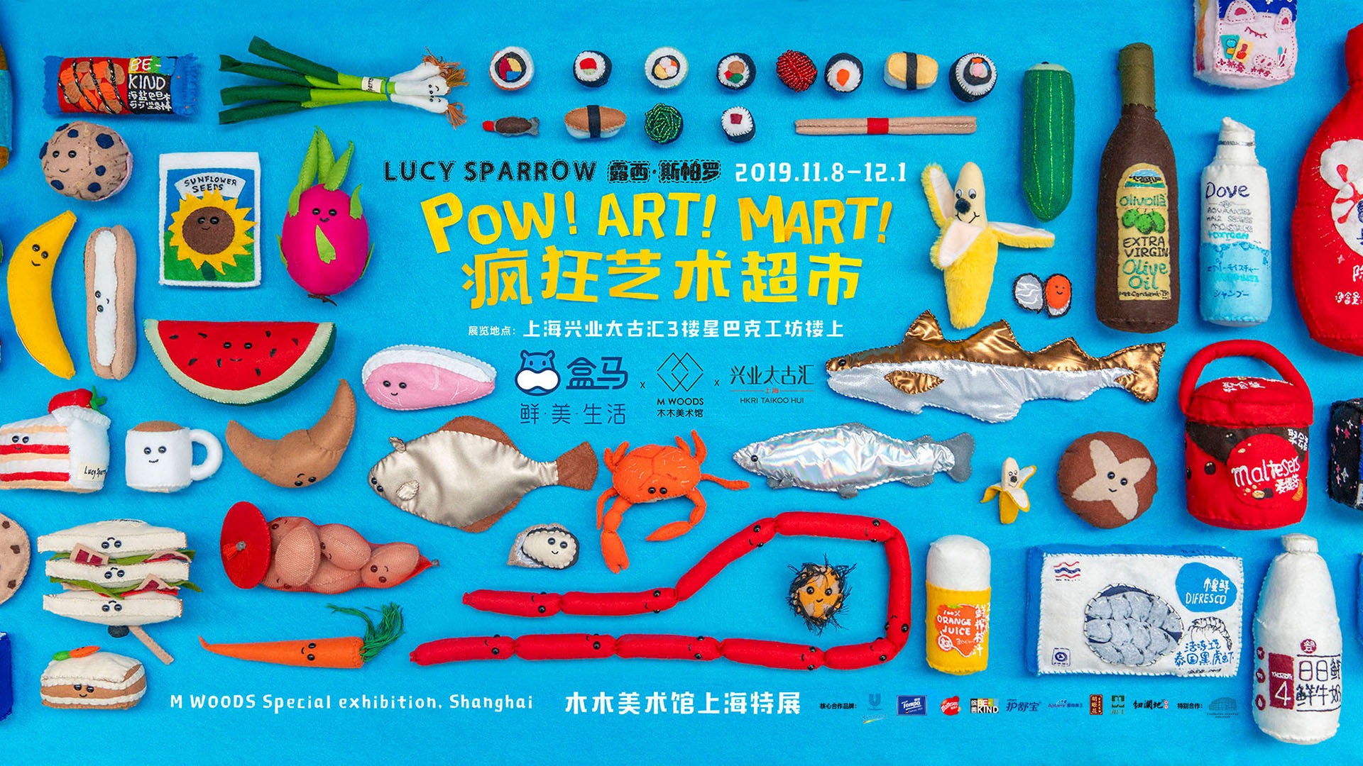 由盒马鲜生与木木美术馆跨界打造的POW!ART! MART! 疯狂艺术超市,落地上海兴业太古汇,将这位艺术家萌翻天的毛毡作品通通带到了我们的面前。