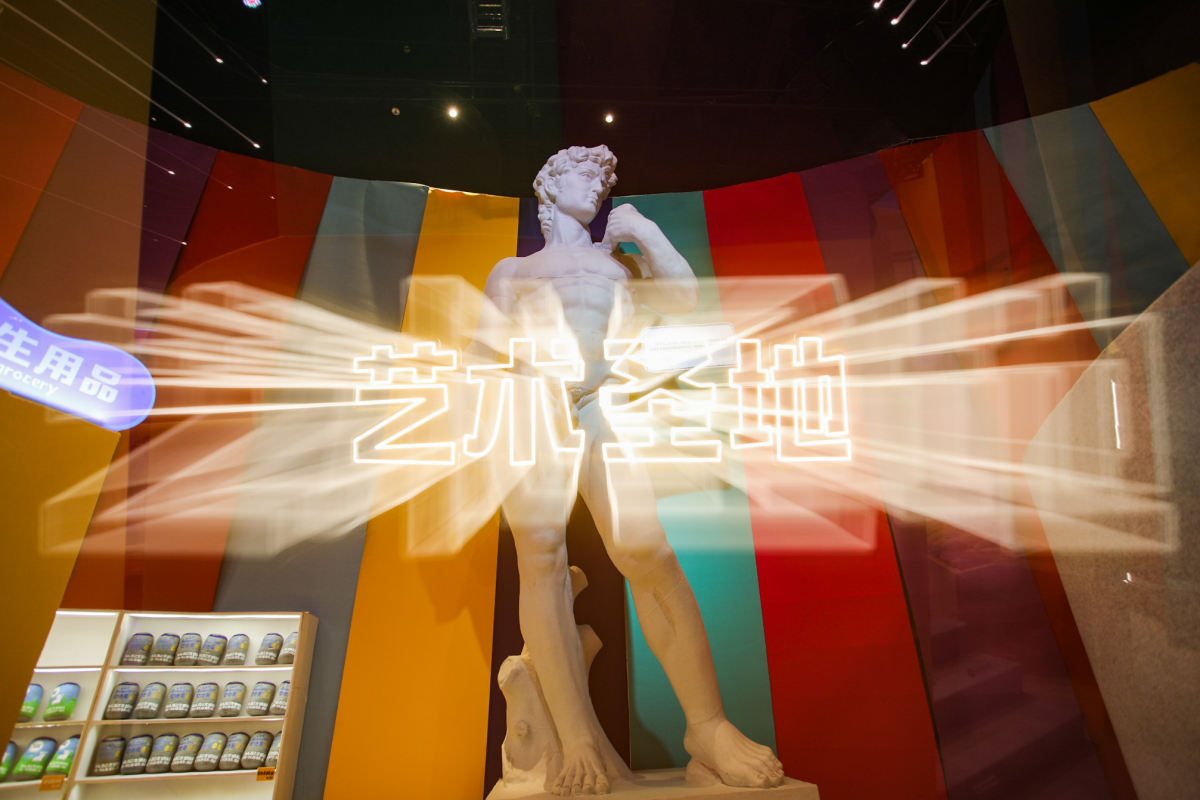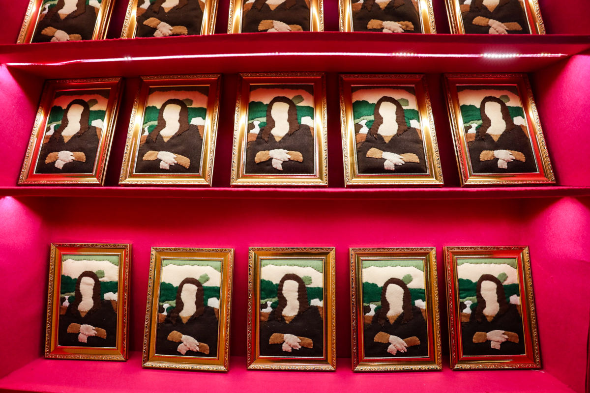 整个超市里隐藏了几十件艺术品,都是从露西·斯帕罗的在北京木木美术馆的亚洲首展“艺术史狂想曲”中精选而来。大卫、断臂维纳斯、蒙娜丽莎、思想者、兵马俑、星空、创世纪等名画和雕塑,万万没想到都能如此毛毡化!