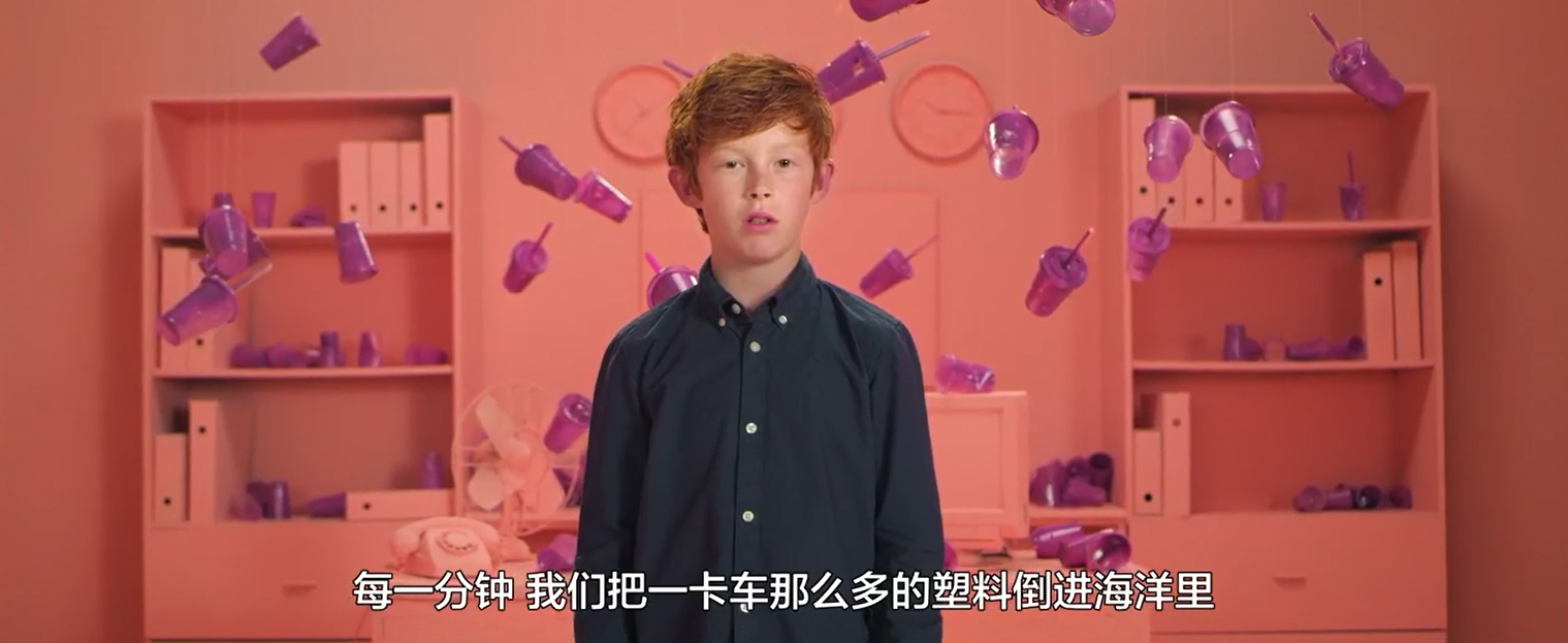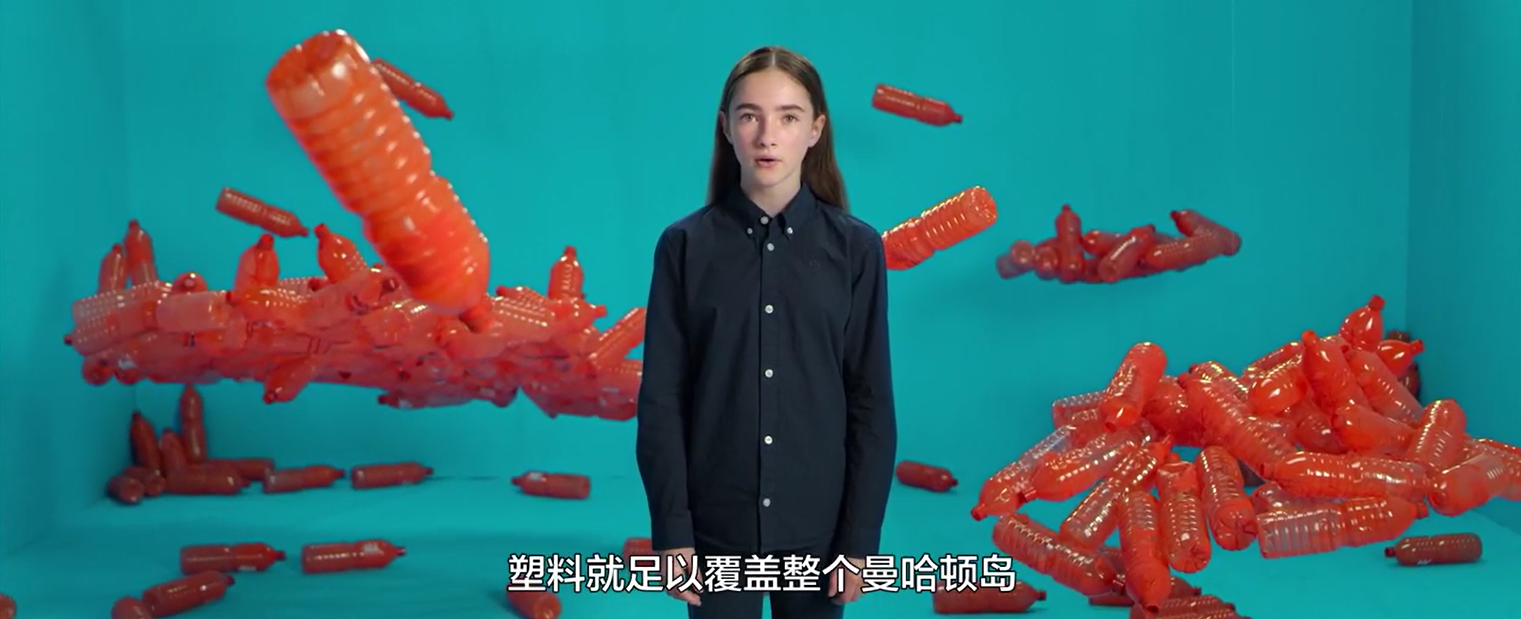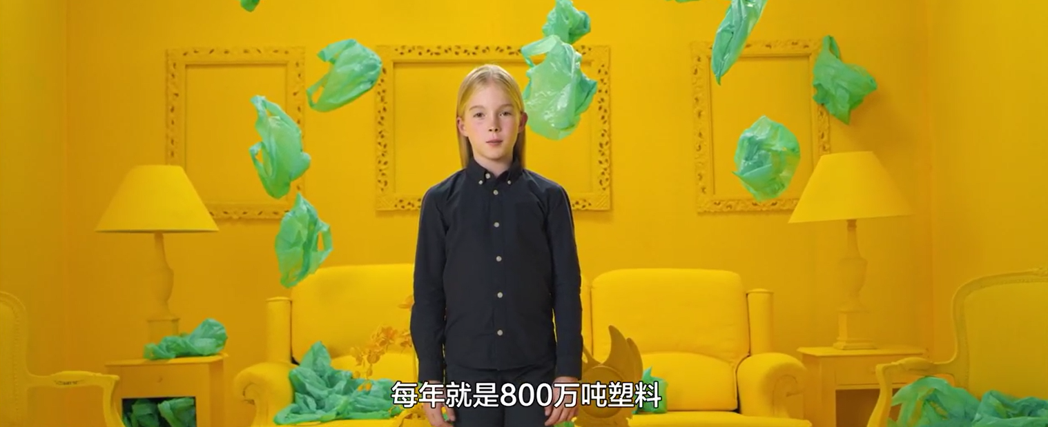 视频中的四个孩子,年龄分别在11至6岁之间,处于可识别的两种颜色的环境中,所以在视频中与我们自然共存的塑料非常醒目,为了提醒人们它们的存在。