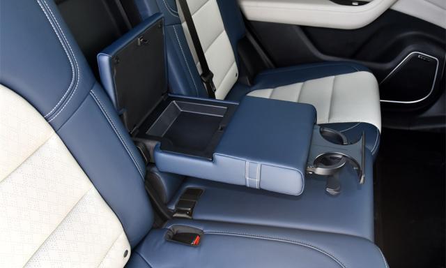 我们来到第二排看一下,驾驶席的座椅调到了正常的驾驶模式,然后第二排是调到最靠后的位置,在这种情况下其实大家可以看到内部空间是非常大的,非常充裕的,跷二郎腿没有问题,另外它的后排舒适性方面也算不错的,后排有两个独立的空调出风口,但是它这个出风口的设计跟其它的不一样,其它的出风口设计一般是会在这个区域,它这个出风口设计跟很多mpv的车型比较像,设计在扶手的两侧了,而且可以独立控制,因为它这个后排上面还有一个储物槽,下面还有一个usb的接口,整体来说还是比较够用的,中央扶手箱内有两个杯架,它这个座椅的坐姿还算不错很舒服,坐垫稍微的有一点硬,整体后排给人感觉就是很宽敞。