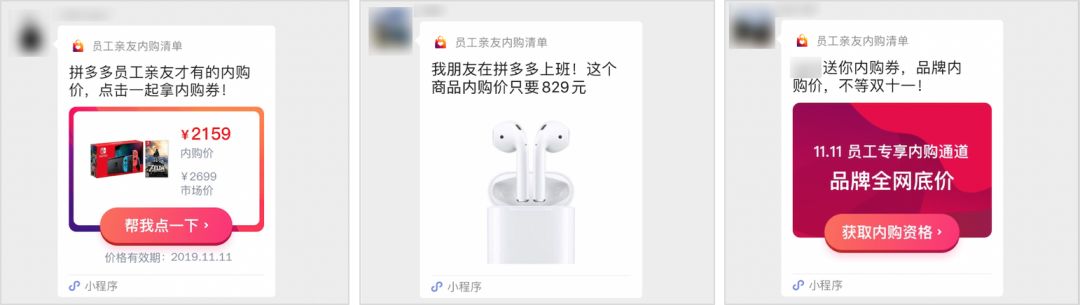 首先,小程序不叫烂大街的什么“限时优惠”,而是叫“员工亲友内购清单”。 “内购”字眼一下子就能抓住用户贪图便宜的心理。而内部员工信息和分享链,则大幅度降低用户戒心,提高了活动的可信度。