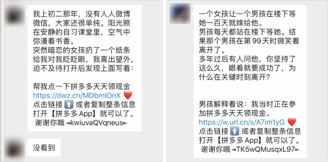 我们再来说说最近“扫荡”了微信好友列表的“天天领现金”活动。 相信大家都有收到各种各样的拼多多红包提现链接。刚开始,它们的文案是这样的。