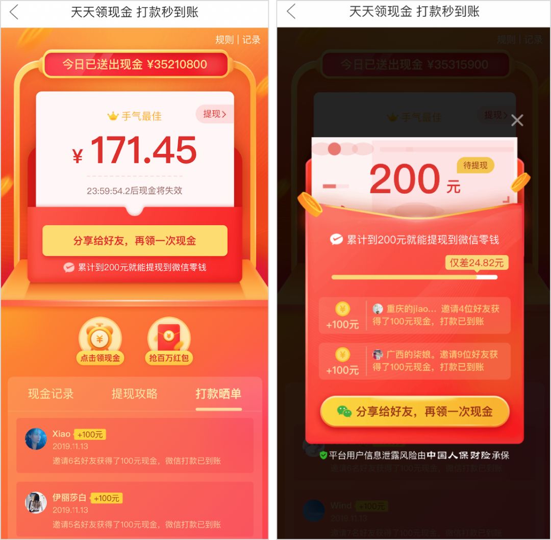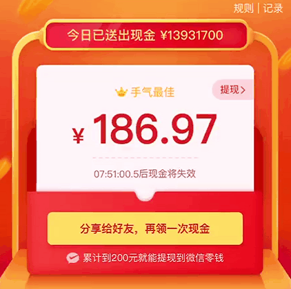 这时候,即使我知道前方大概率是个坑,也忍不住往下跳了。 果不其然,现金需要累计到 200 元才能提现,而且是要在 24 小时之内完成。 那怎么样才能攒到 200 元呢?很简单!分享给好友即可。