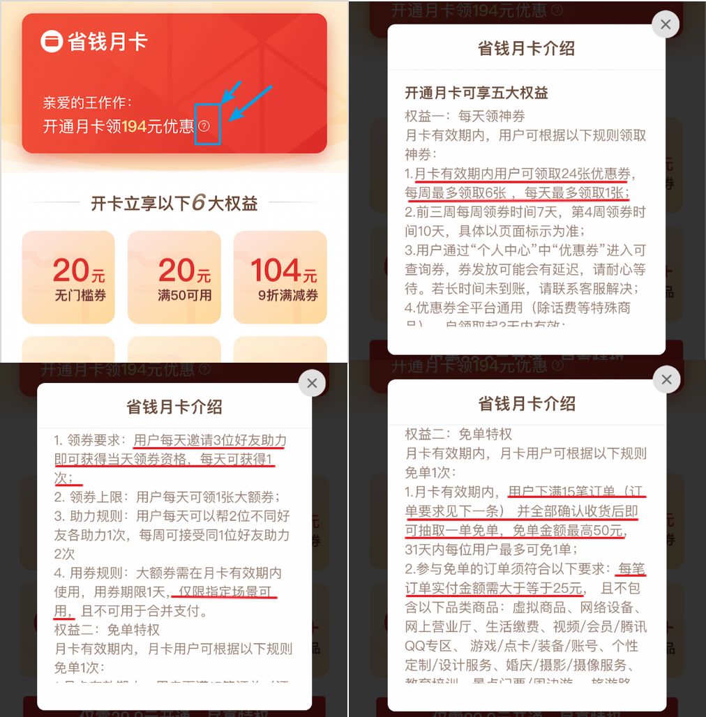 不想错过任何拼多多玩法的我,立马研究了一番。 结果不了解不知道,一了解发现其中的“猫腻”也太多了,上文两种玩法在“省钱月卡”面前,简直就是小巫见大巫。 在拼多多的个人中心,可以看到“省钱月卡”,称开卡可以领取194元优惠,享受“20元无门槛券”“满50减20元券”、“104元9折满减券”、“每个月1单全平台免单”等6大权益。