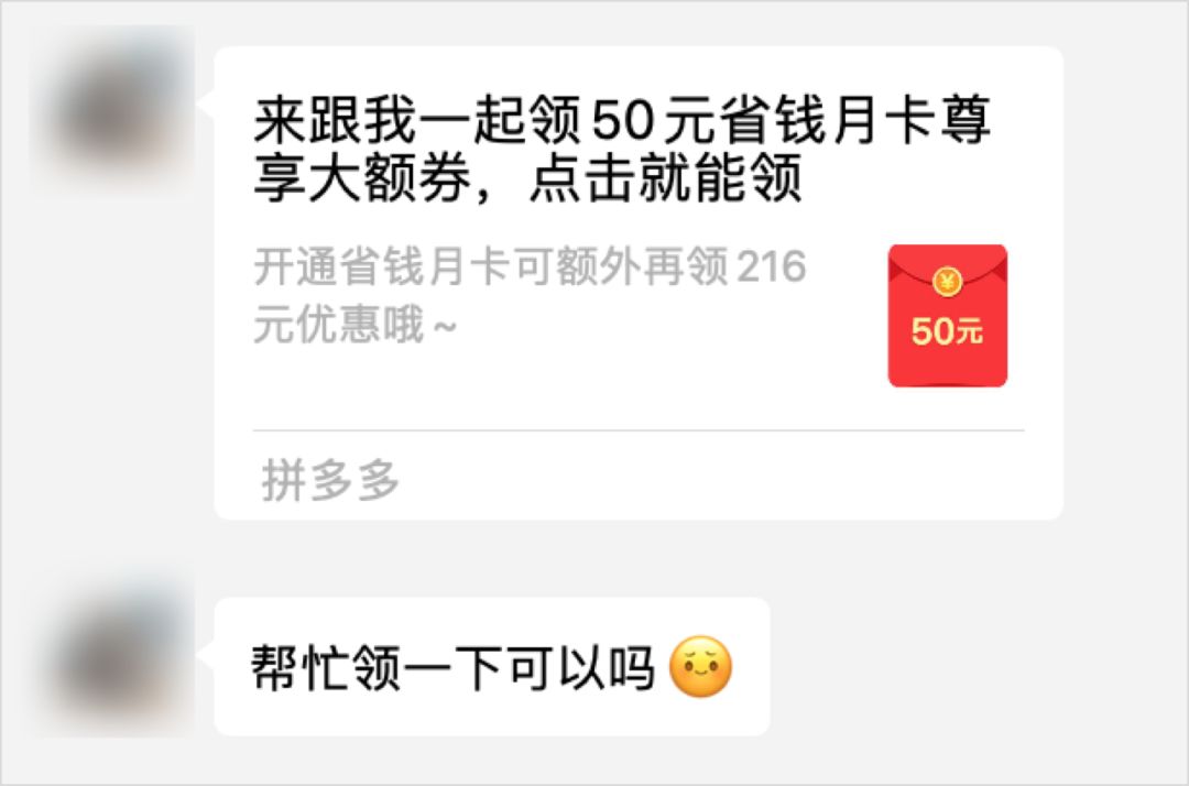 本来这篇文章我是只打算扒一扒前面2个活动的,没想到昨天找设计小哥哥提需求的时候,他转手给我发了一个求助链接,“来跟我一起领50元省钱月卡尊享大额券”。