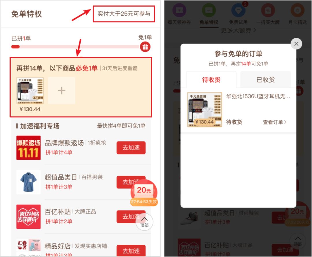 一方面,你得买够 15 单才能享受到免单福利,每单价格需要 25 元以上,或者在指定专场购买(价格会更高)可以 1 单计多单,反正基本上就是要先花 375 元左右。 另一方面,我理解的“全平台免单”跟拼多多给的似乎也不太一样,免单的商品是给定的,拼的单越多,可选择的商品越多。目前拼 15 单的选择是一款形似 AirPods 的百元耳机。