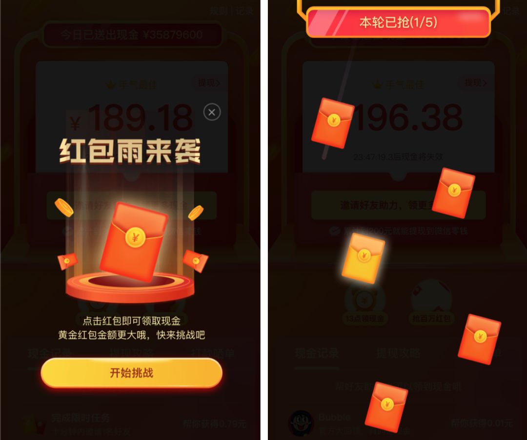 刚开始,一切都显得很容易,邀请好友、完成限时任务(十分钟内邀请1名好友)基本上可以获得几块钱。 其中还有系统提醒“红包雨来袭”,点击红包即可领取现金,黄金红包金额更大。 但实际上,黄金红包并不难抢,随便都能点到。