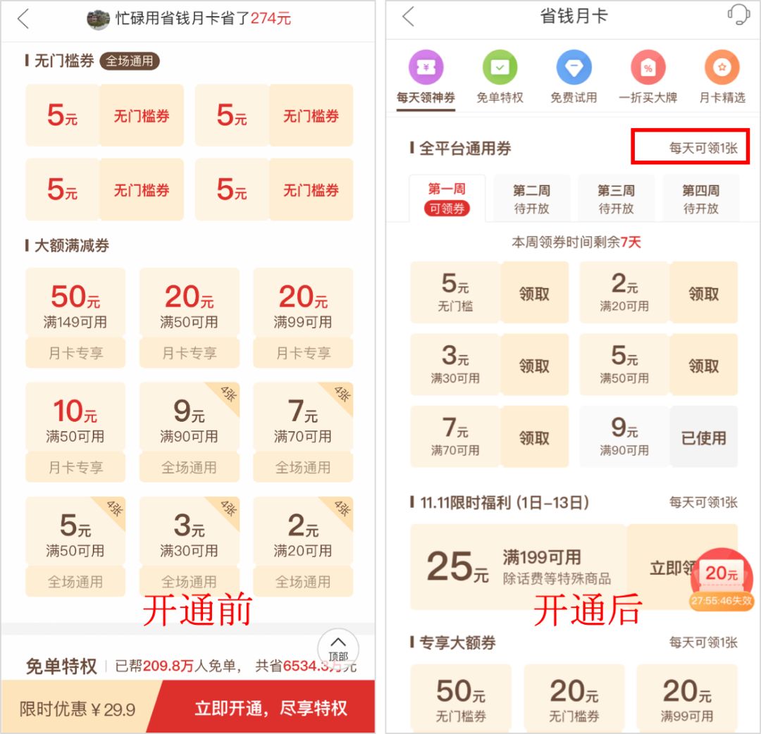 月卡类似 88VIP 和京东PLUS会员,主要目的是提高用户的 ARPU 值,似乎没什么问题。 但是!拼多多永远不会让你“失望”。 第一,开卡的价格不统一。 而且拼多多月卡不是像 88VIP 那样有个统一的标准(淘气值 1000 以上 88 元,以下 888 元),同样是新用户,有人 5.9 元就能开卡,有人却要 29.9 元。