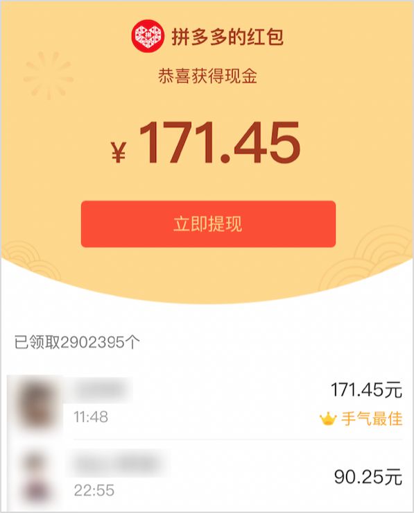 在我第一次看到这个链接时,内心并无波澜,觉得不过是拼多多拉新的惯用伎俩。 结果当我帮对方开完红包之后,拼多多马上恭喜我:手气最佳!获得现金