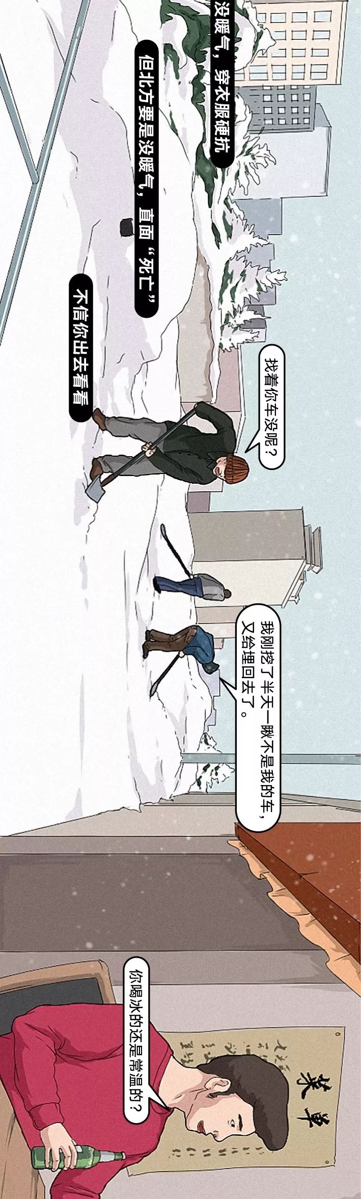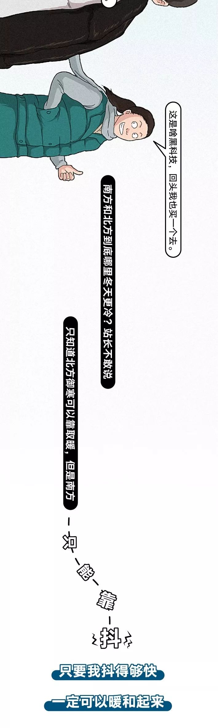 不管是南方的魔法攻击(80%护甲穿透+水属性魔法攻击),还是北方的纯物理攻击,都给了全国人民一个实实在在的暴击。此时对于南方人来说全身最暖和的地方是屁股底下,每个南方人都有双快被压扁的手;北方人暖手的方式则是把手伸进别人羽绒服帽子下面,或者脖领子里。对于站长这种不爱出门的人来说,觉得南方更冷。不过听说南北交接却不供暖的地方能返老还童,物理魔法混合双打,70岁的大爷分分钟冻成孙子,每天哆哆嗦嗦起床出门,哆哆嗦嗦回家睡觉,一看路上大家都抖出了重影,实在是惨。还有说法是南方一到冬天电竞水平普遍下降,因为室内太冷。咱也不知道是真是假,先不说了站长去上分了。