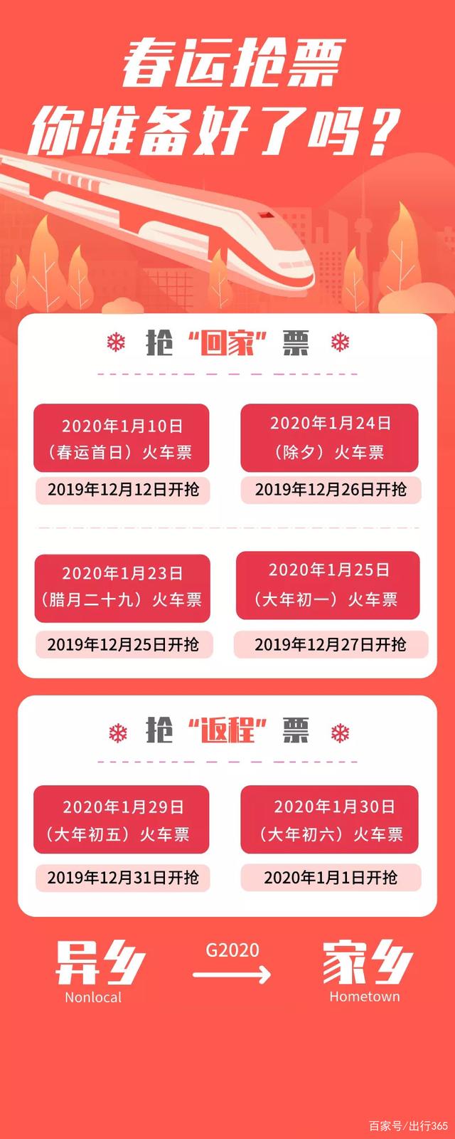 所以,2020年1月22日(腊月二十八)、1月23日(腊月二十九)为出行高峰期,火车票起售时间为2019年12月24日和25日;2020年1月29日(正月初五)、1月30日(正月初六)将迎第一波节后返程高峰,返程抢票日期为2019年12月31日和2020年1月1日。