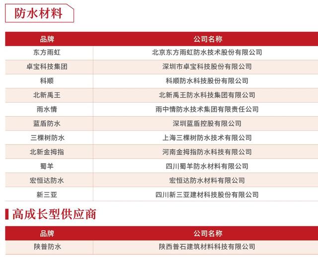 整体的趋势是,房企对于防水这类隐蔽工程的质量控制愈发严格,由于无法分辨质量、试错成本过高,所以近年来房企选择品牌实力强的大防水企业趋势明显。如东方雨虹、卓宝科技集团、科顺凭品牌影响力、质量、资金实力等持续获得开发商青睐,品牌优势明显。另外,北新禹王、雨水情、蓝盾防水等深耕区域的房企也获得开发商认可。