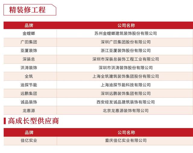 从榜单来看,远大铝业、亚夏幕墙、金螳螂、江河集团等企业因质量好、配合度高、服务佳等优势,大受房企欢迎。相比去年来看,行业不断洗牌升级,集中度也进一步提高,头部企业的开发商合作度进一步提升。未来,提升标准化、系统化、信息化,是企业想要获得较快发展的关键。