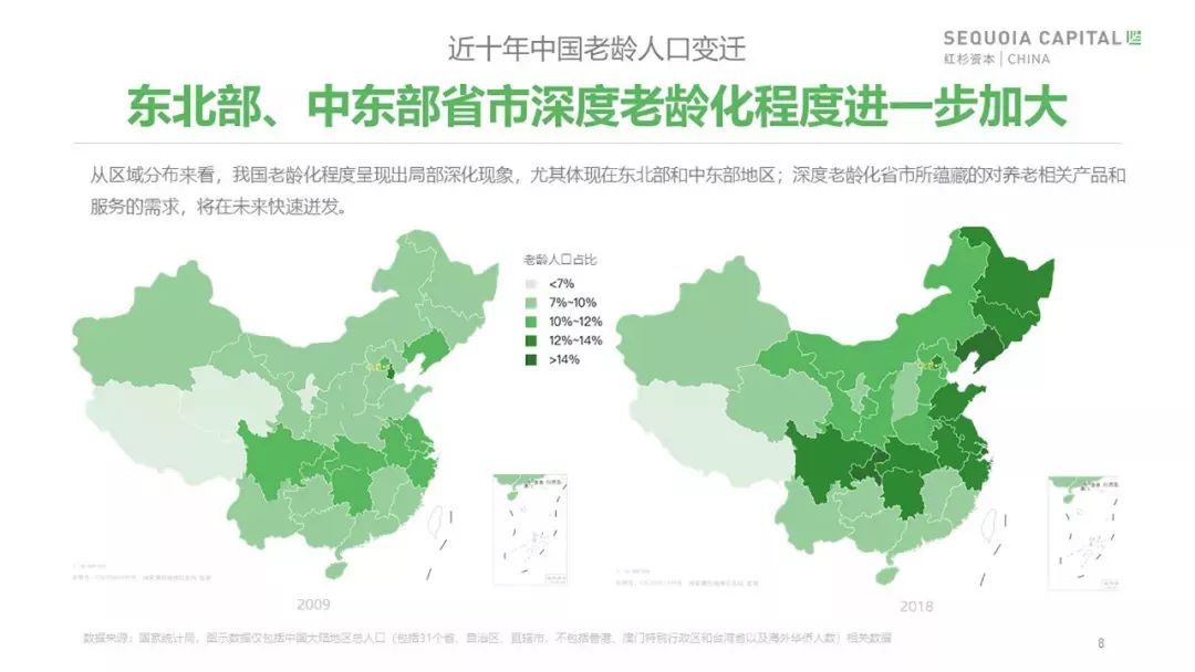 中国中东部的老龄化程度在过去10年迅速加深,这些地区对养老产品和服务的消费需求有望在未来10-20年内迅速迸发,是创业者和行业从业者应该重点关注的地区。