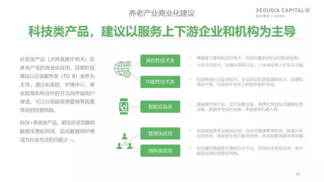 但由于相关政策和基础设施的更新可能无法及时跟进,因此建议目前阶段以企业服务类(TO B)业务为主导,通过和医院、护理中心、养老院等机构合作的方式向终端用户渗透。
