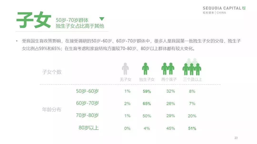 城市50-70岁群体的一大特征是,他们很多是我国第一批独生子女的父母。这一特点随着城市级别的升高越来越明显。