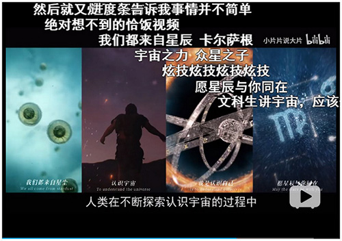短片采用30s短小精悍的叙事,从“宇宙大爆炸→星尘演变→地月碰撞→细胞诞生→人类进化→文明探索→走向未知”的系列,保证了视频观感的丰富性,同时传递出“我们都来自星尘”、“认识宇宙,就是认识自己”、“愿星辰与你同在”三层特定的内容涵义。