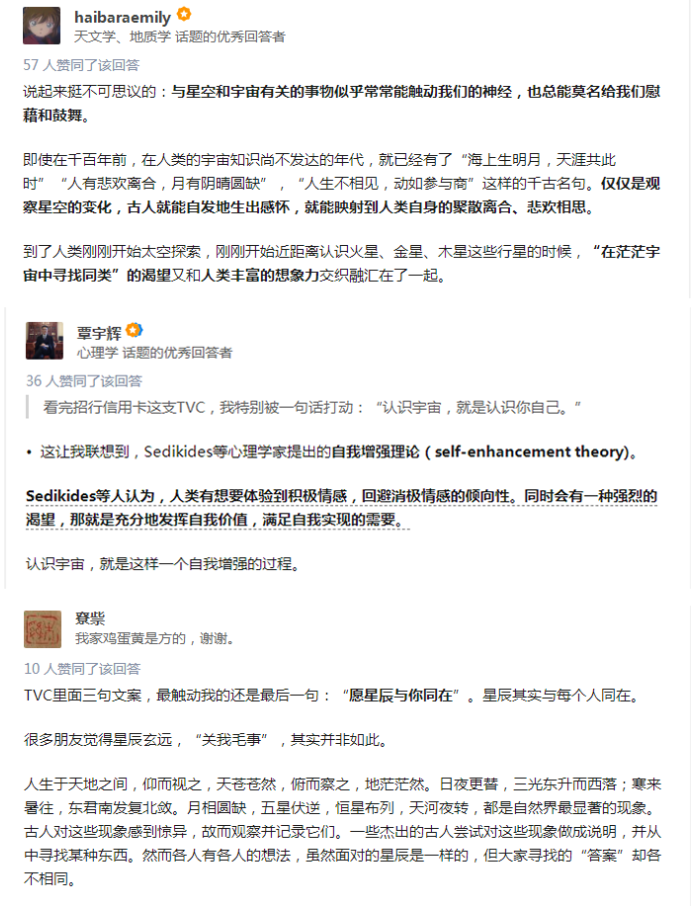 再次,在问答社区知乎,不同大神从天文学、心理学、哲学、科幻作品、星座等角度出发,发起星座守护卡TVC的评价和讨论。