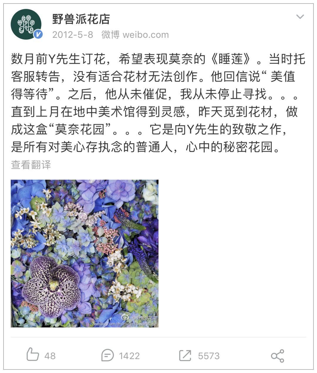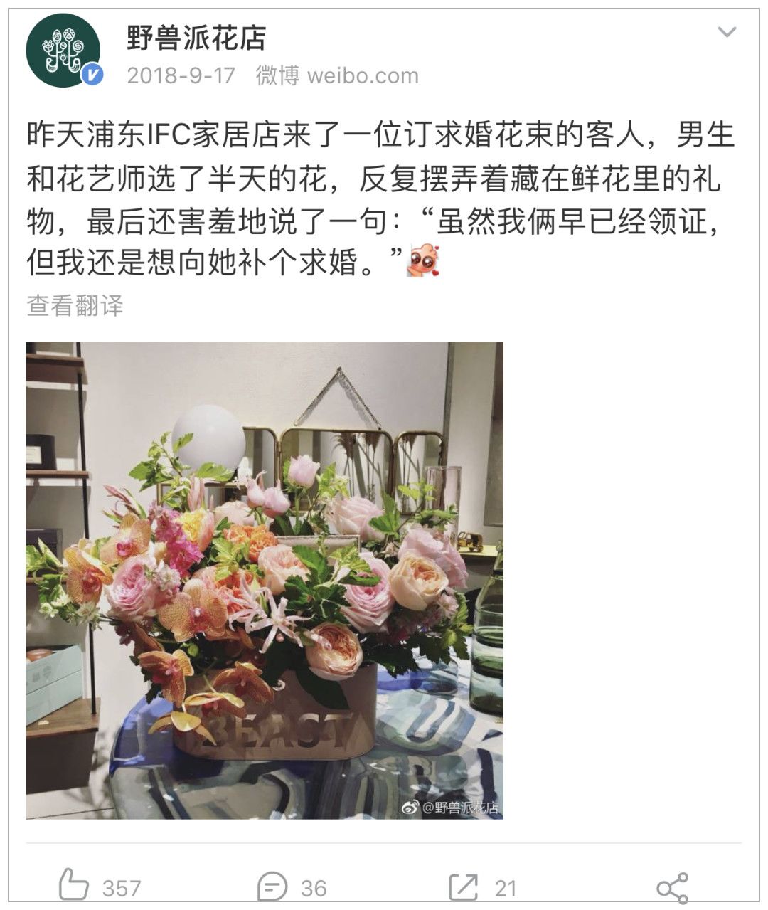 鲜花本就是一个品控不稳定、损耗率高的行业,再加上野兽派这种没有标准品无法规模化生产销售、依赖人手、仅凭感觉的商业模式,听上去就像是天方夜谭。 当然,如果仅凭这种逻辑,确实难以支撑野兽派发展至今,而亮点就在于野兽派会把顾客的情感故事,以匿名的方式浓缩成 140 字的微博发出来,并配上相应的花束图片。