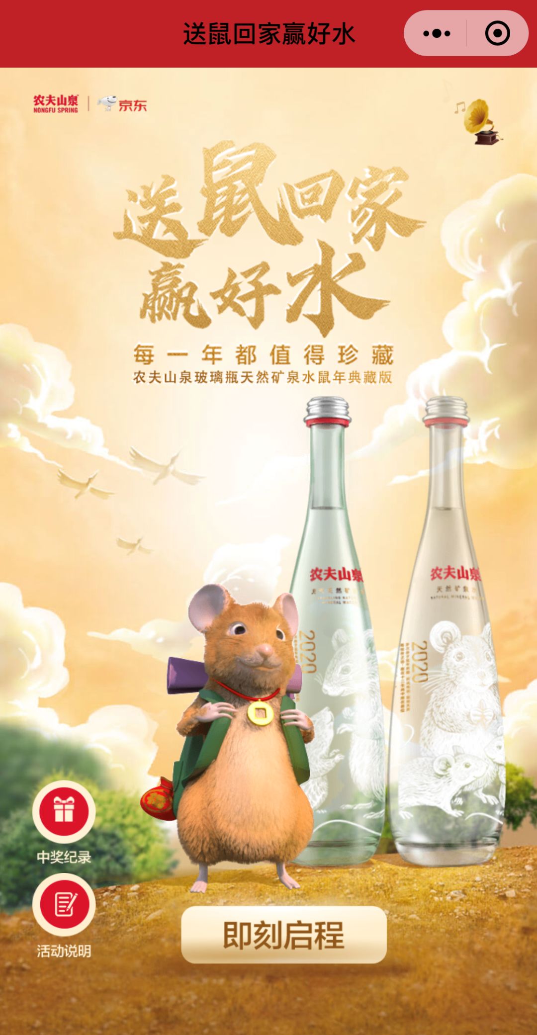 老规矩,二十万套,只送不卖~通过扫描农夫山泉“金鼠贺岁好水旺财”促销装的瓶身二维码,进入实景VR扫描,抓住你身边出没的小金鼠,就有机会抽中金鼠瓶大奖。众所周知,每一年春节前夕,农夫山泉都会推出一款限量典藏生肖瓶。