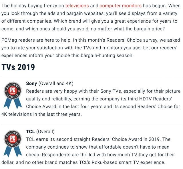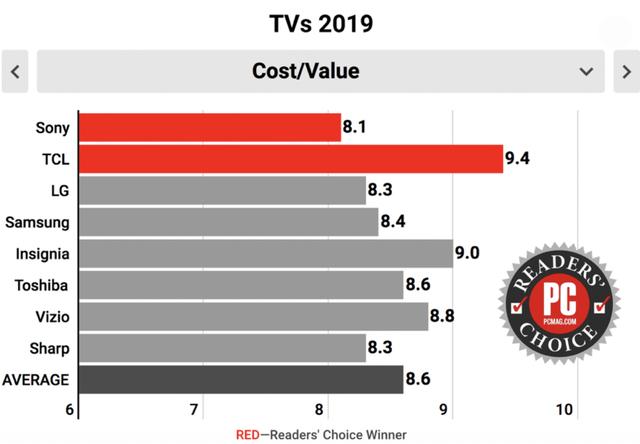 正是因为如此,美国pcmag将2019电视读者选择奖给了tcl和索尼,值得注意的是,tcl也连续两年获奖了。