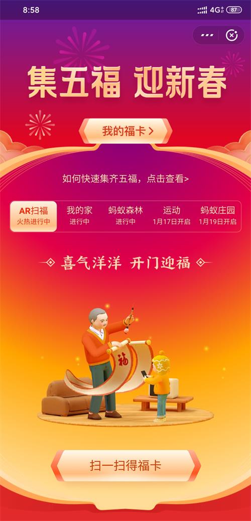 在集福的方式上,今年的活动和去年的差不多,主要还是通过AR扫福、蚂蚁森林、支付宝运动、蚂蚁庄园等等,去年的“沾福气”卡在今年也是得到延续。今年还增加了“全家福”,拥有“全家福”就有机会抽取“帮还全家花呗大奖”,1月24日开奖,共888份。和家人组建“我的家”的话,奖品金额还能从18888元提升到48888元。这回支付宝算是把“团聚”的主题搬出来了。