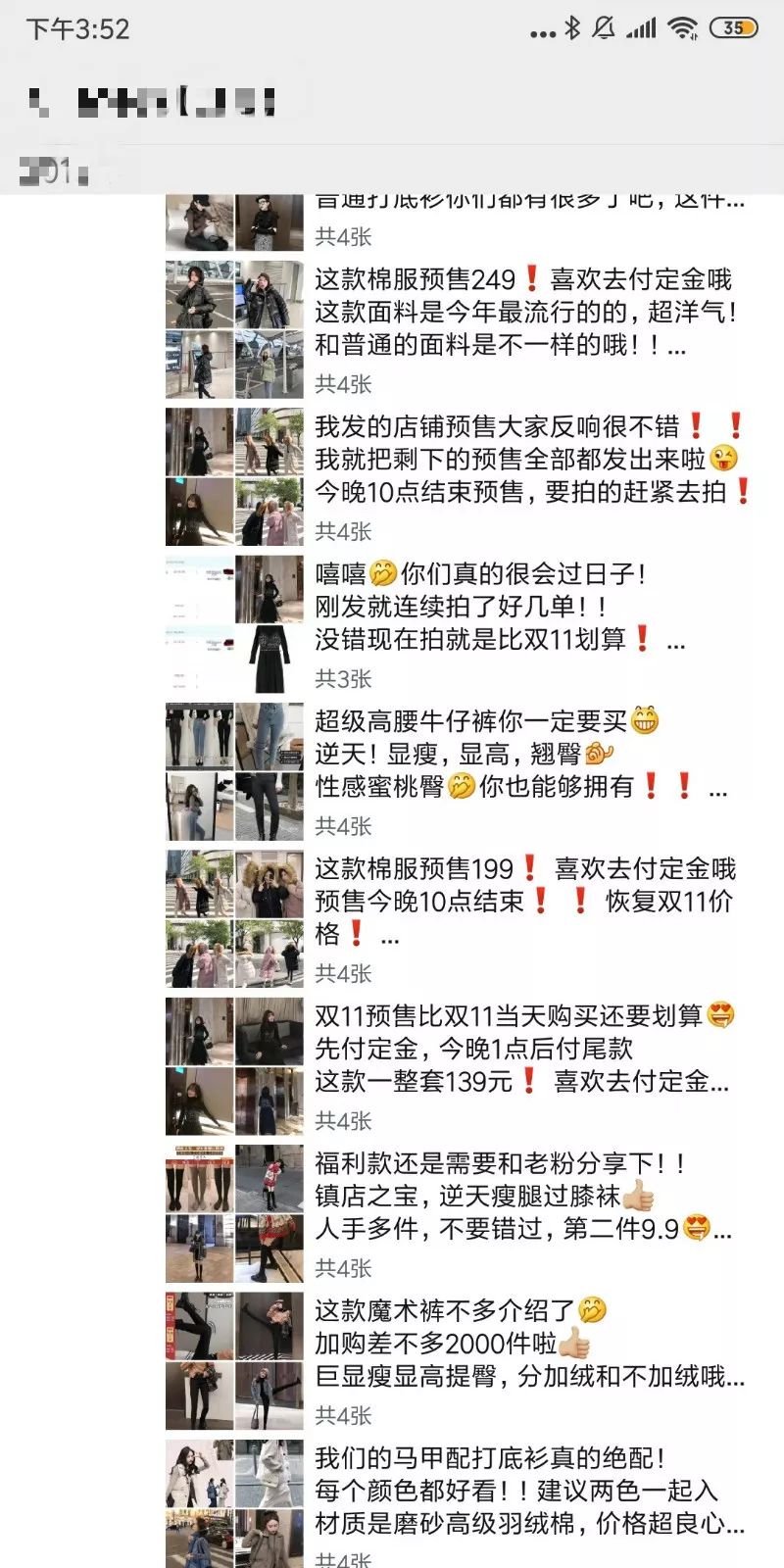 再比如另一家走气质女神风格的淘宝女装店铺,进入她的私域流量池后,瞬间从线上的高端,气质,洋气;变成了线下服装批发市场的既视感……